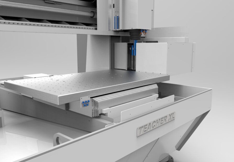 La TEACHER XL è un centro di lavoro a 3 assi continui con struttura in acciaio estremamente robusta e con un’ampia area di lavoro. Adatto a lavorazioni di materiali ferrosi e non, dotato di sistema di lubrificazione e cambio utensili automatico. Possibilità di montare un elettromanadrino da 13kW a 30.000 rpm con elevata coppia a basso numero di giri , adatto per la lavorazione di acciaio inox. Alla raccolta dei trucioli provvede una vasca estraibile. Ha una configurazione a portale fisso, gli assi X e Z vengono dati all’utensile mentre l’asse Y alla tavola porta pezzo, posta sulla base. Gli assi corrono su guide di precisione con ricircolo di sfere. I motori assi brushless con trasduttore digitale sono collegati direttamente alle viti.